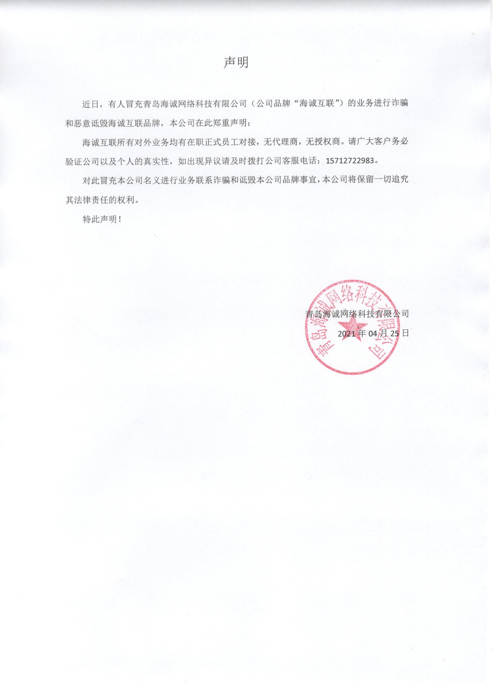 近日,有人冒充青岛海诚网络科技有限公司(公司品牌“海诚互联”)的业务进行诈骗和恶意诋毁海诚互联品牌,本公司在此郑重声明: